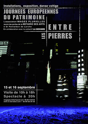 Entre les pierres est la rencontre entre patrimoine rural et art contemporain. Aux installations plastiques, photographiques et vidéo s'ajoute une proposition chorégraphique avec 2 danseuses de la compagnie contemporaine Pichenibulle.