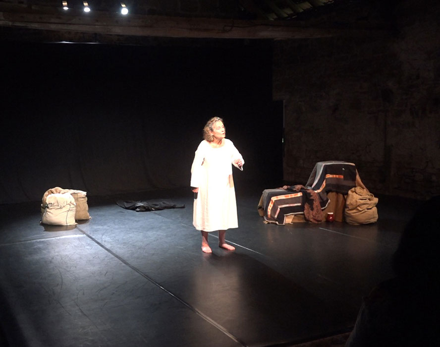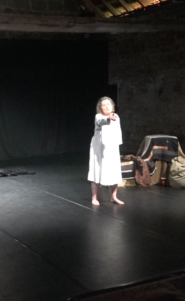 Le mot devient geste et ce geste prend toute sa place dans l'espace du lieu, dans l'espace du mot et dans l'espace du silence quand le mot n'a plus besoin d'être prononcé, qu'il est « avalé » par le corps tout entier. Le corps n'est pas dans la simple illustration, il est libre et par cette liberté il peut donner à ces mots un nouveau sens, les transformer, les malaxer. Jouer, en jouer... C'est donc une danse qui se crée dans l'instant, en dialogue avec le texte.